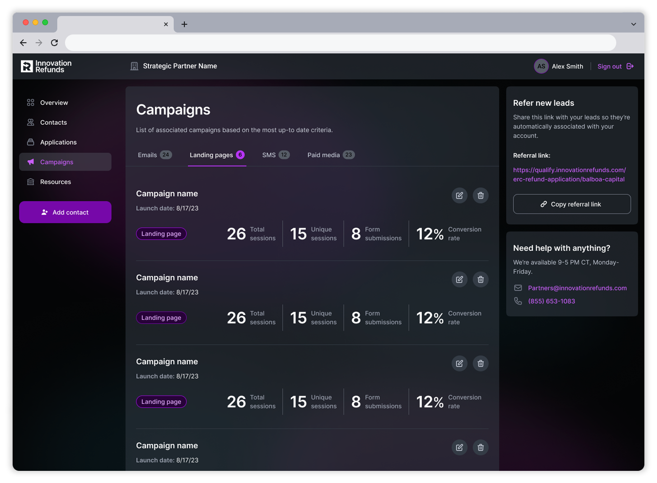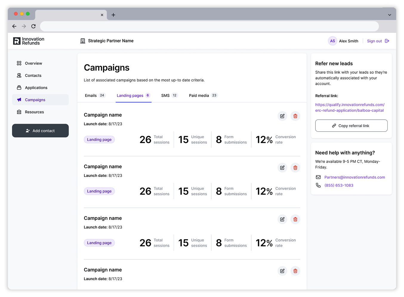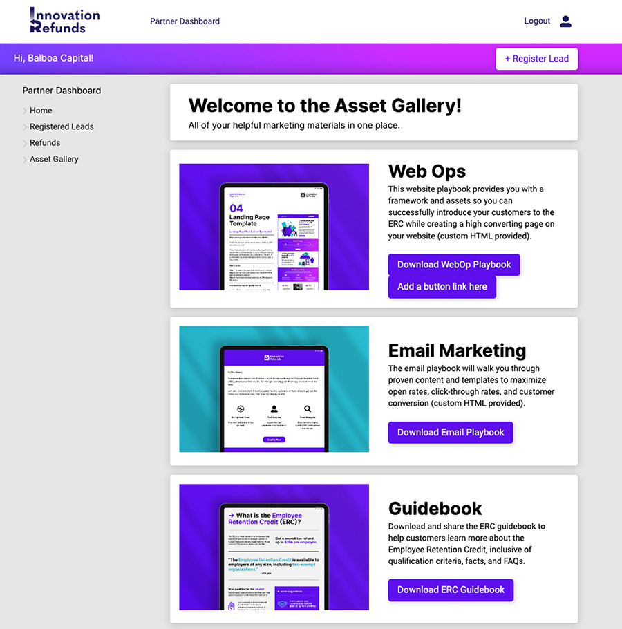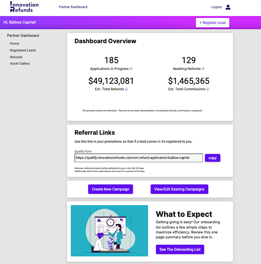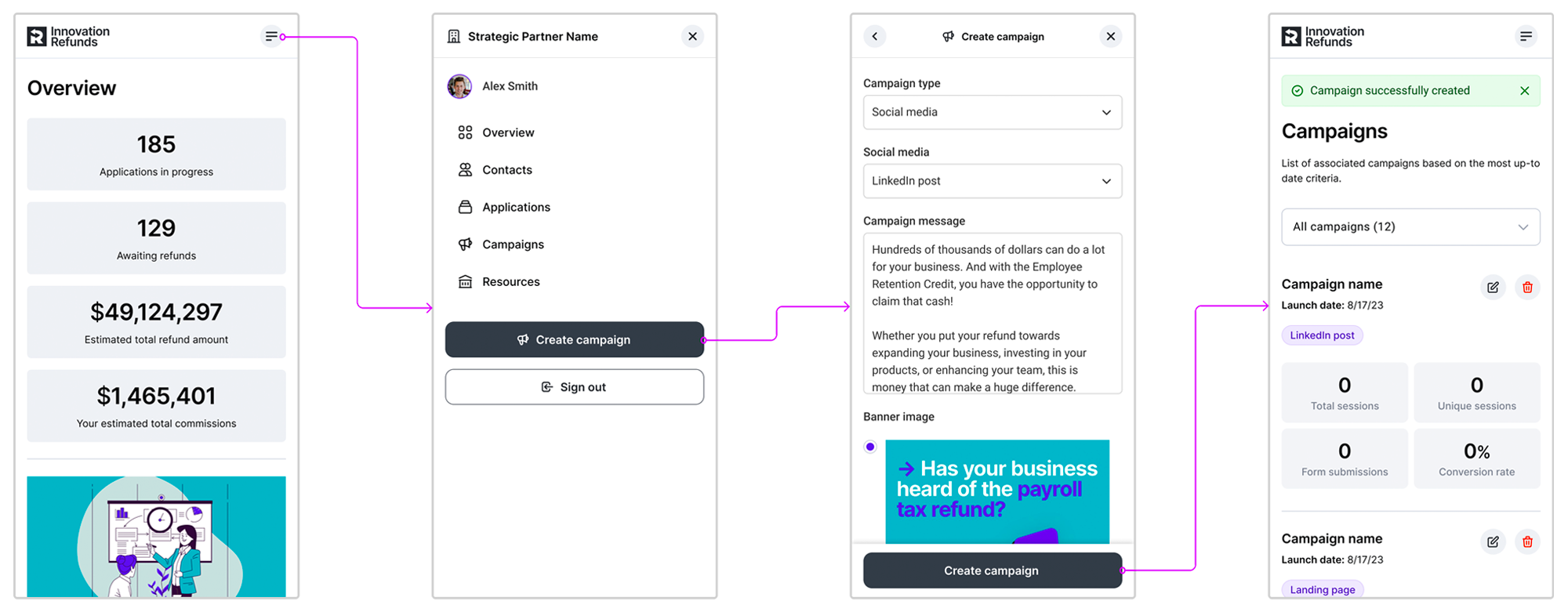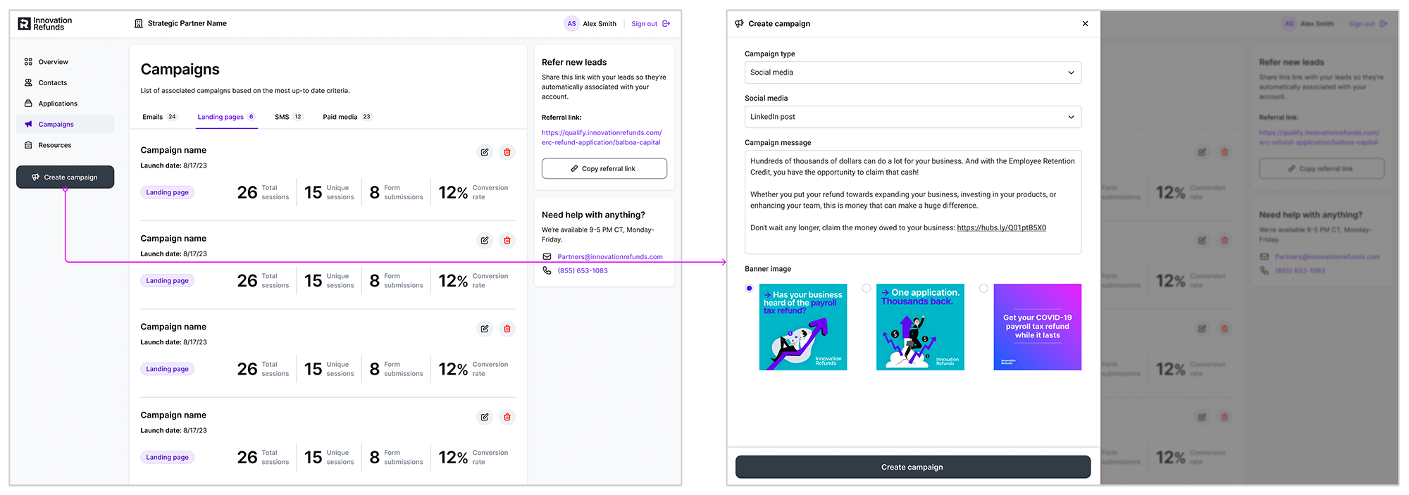 As an affiliate customer, I want the ability to easily create marketing campaigns to promote Innovation Refunds services for providing tax credits so that I can drive customer adoption.