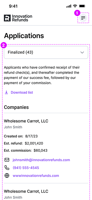 Once the desktop experience was established, I then got to work on the mobile experience. To maintain a seamless responsive experience, I leveraged the menu nav to house all main navigation items and primary funtions. The biggest challenge was to create a vertical-oriented list view of the applications table.