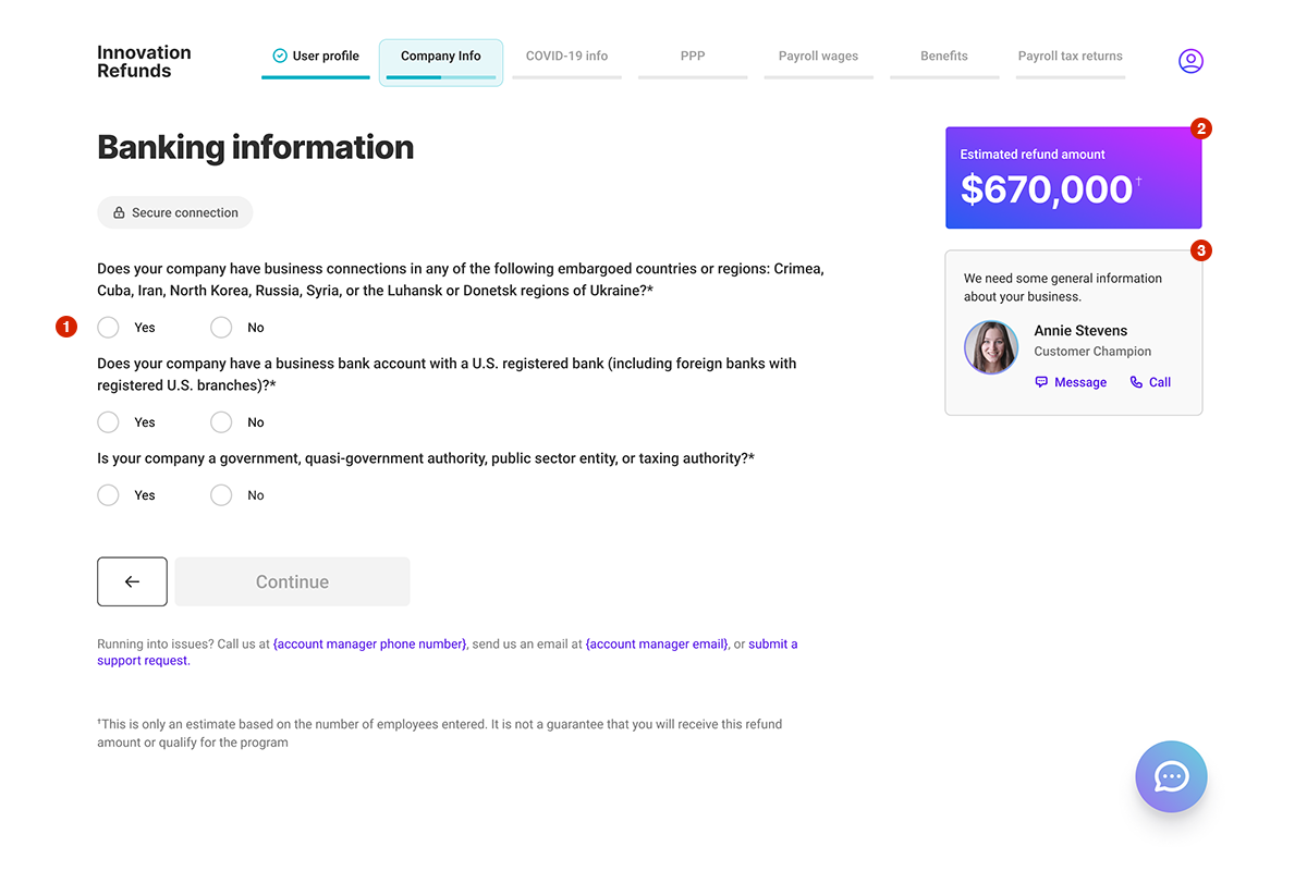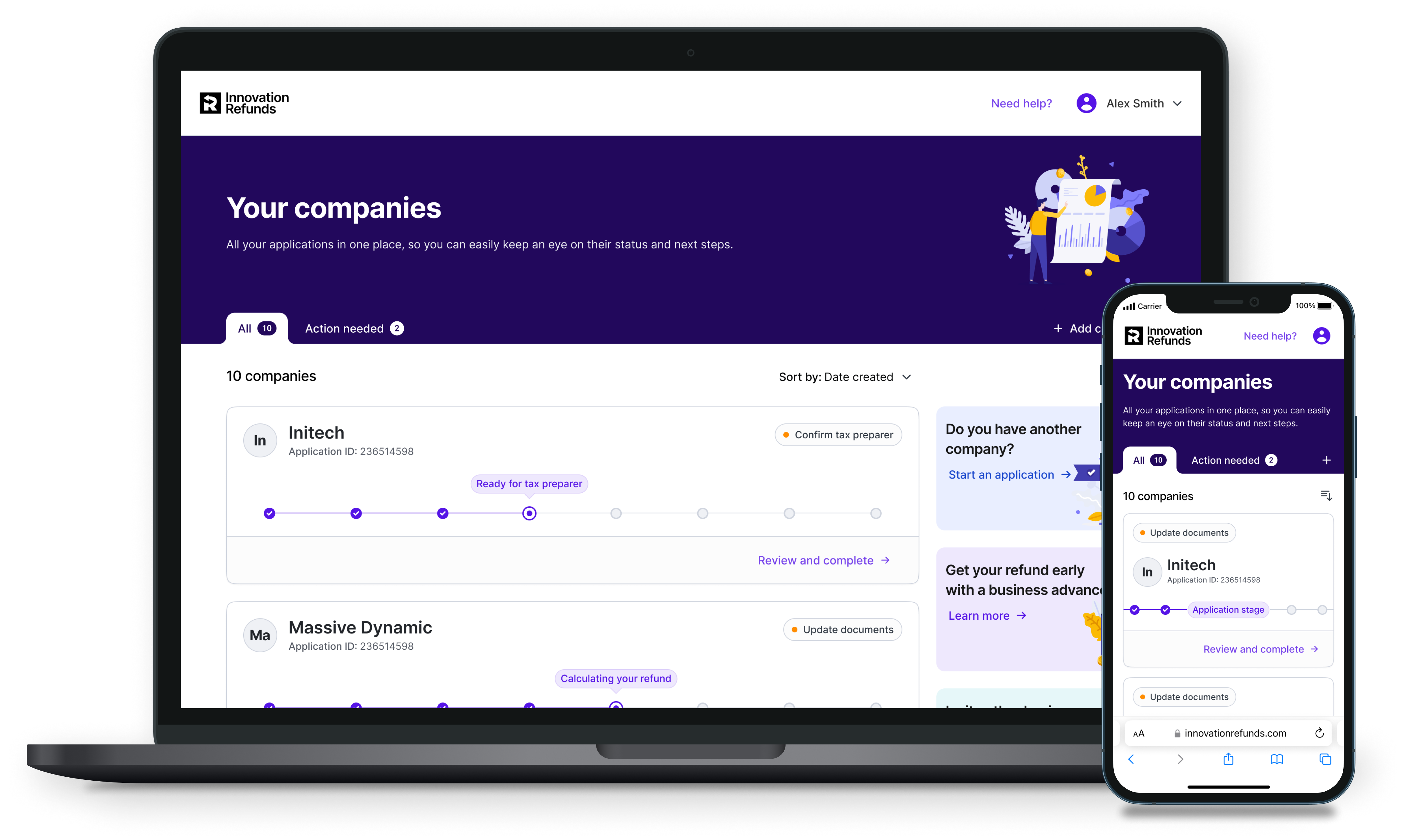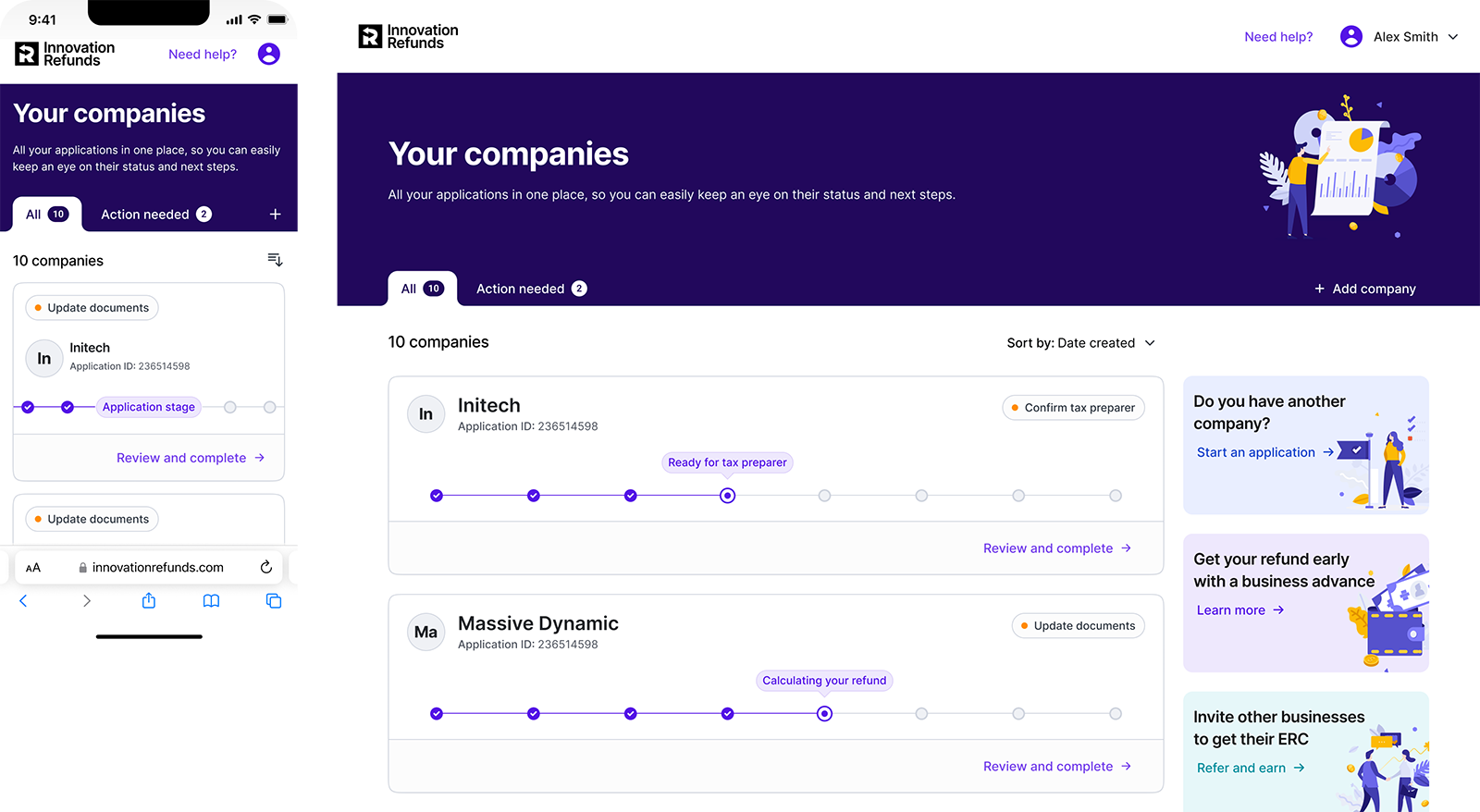 Innovation Refunds is a financial services company that provides access to specialized government funding to Small and Midsize Businesses (SMBs). The platform simplifies tax credit applications, making it easier to access financial incentives. The UI/UX Refresh project was aimed at streamlining the user experience and improve accessibility, addressing navigation issues and unclear instructions.