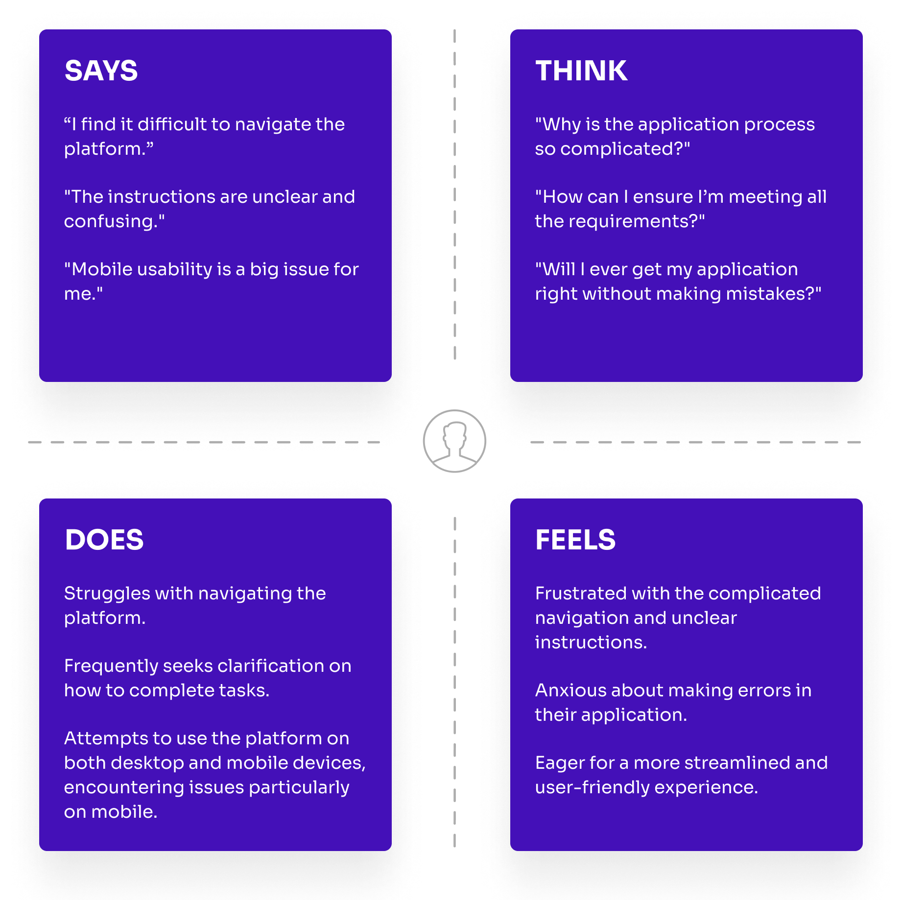The empathy map provided valuable insights into our target users by capturing their perspectives, thoughts, feelings, and behaviors. Through our user research, including interviews and surveys, we identified key pain points and needs. This empathy map guided our user-centric design decisions, ensuring we effectively addressed the challenges faced by our users and created a more intuitive, accessible, and satisfying experience on the Innovation Refunds platform.