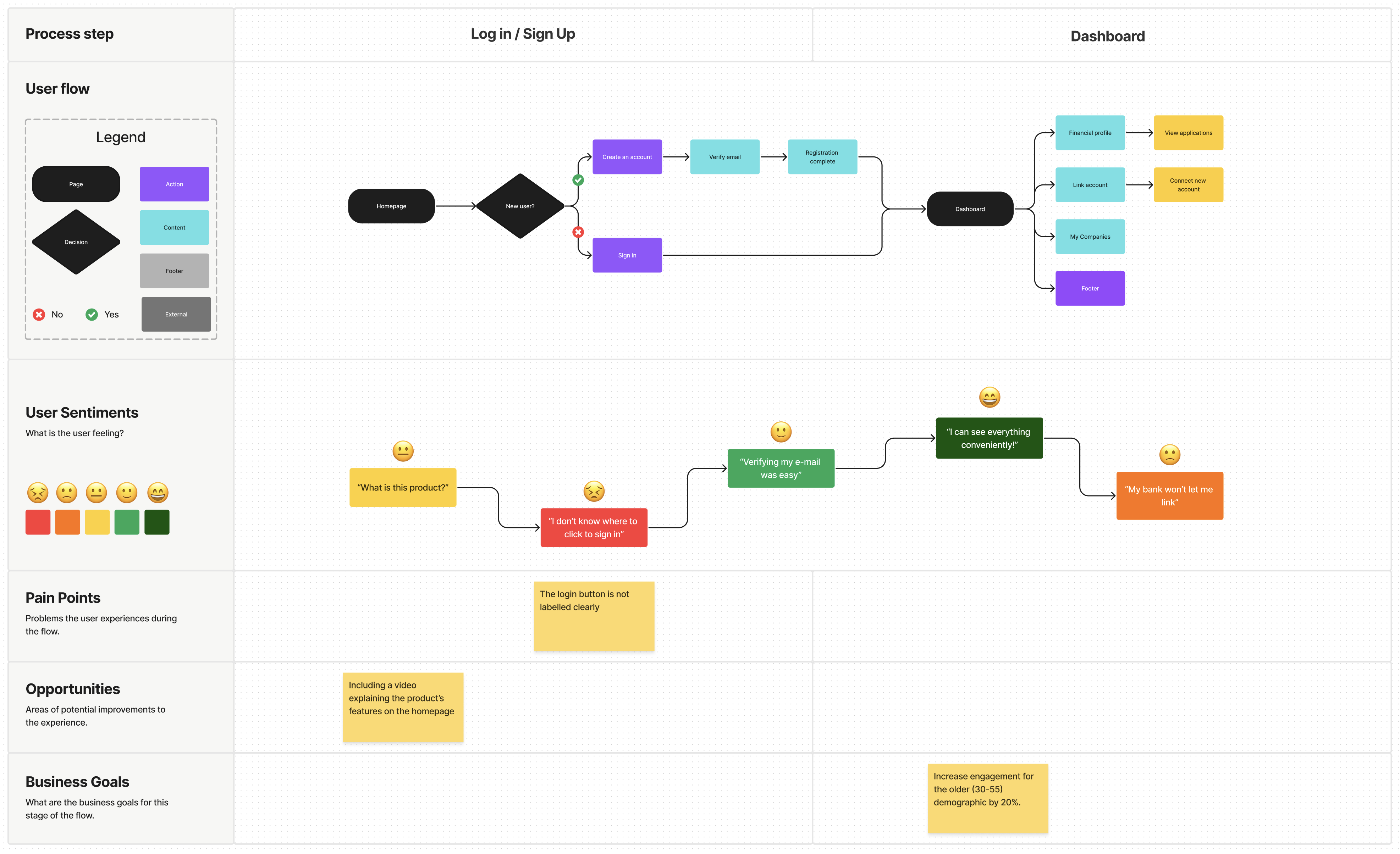 After we had a good sense of our user needs, along with project requirements, the team and I got to work building out a journey map to visualize the user experience througout the application process. This process highlighted pain points and opportunities for improvement, helping us design a more seamless and satisfying user experience. By understanding the entire journey, we could ensure that each touchpoint was optimized for usability and accessibility.