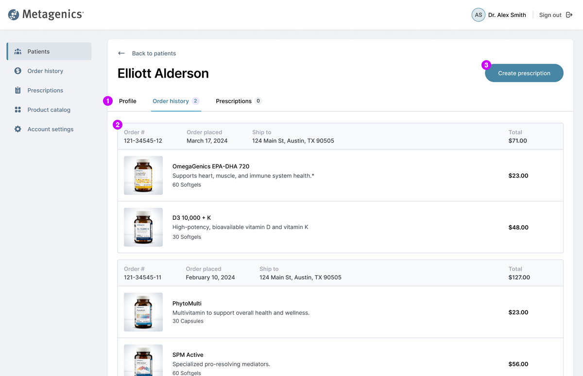 1Tabs allow physician to view profile info, order history, and prescriptions.