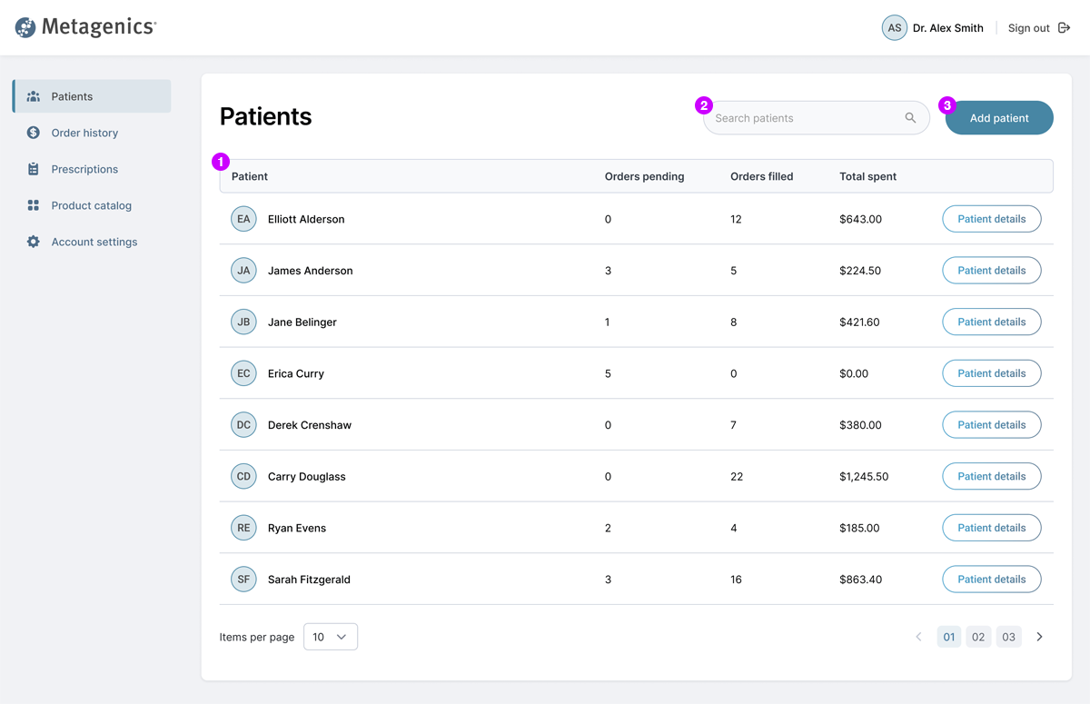 As a physician, I want to see a list of all patients so that I can monitor order history and prescription adherence.
