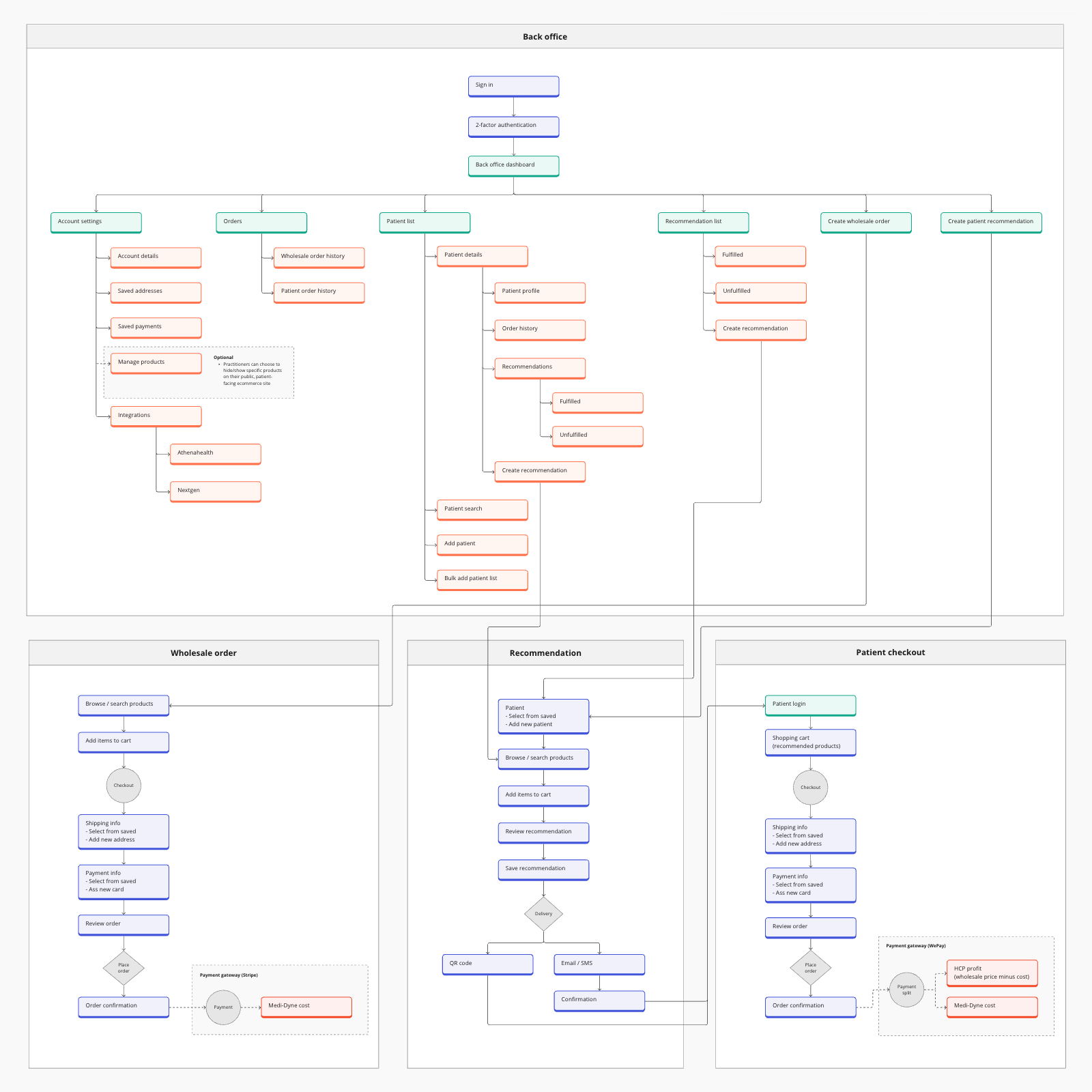 After we had a good sense of our user needs, along with project requirements, I got to work on building out a site map of the platform experience. I started with the physician back office experience, mapping out all necessary screens to best meet customer needs. From there, I built out the product recommendation and patient checkout flows to complete the overall experience.